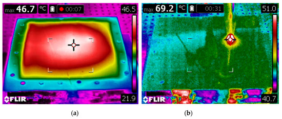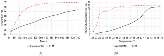 The experimental research results of the polymer sheet surface temperature versus time and polymer sheet displacement from gravity versus temperature are presented in Figure 8a,b, respectively. As it can be seen from the results presented in Figure 8a, maximum temperature of the polymer sheet after 2 s from the start of heating is equal to 25.8 °C and after 780 s is equal to 45.5 °C. Figure 8b shows that displacement of the sheet surface increase significantly after surface reaches temperature 31 °C and is maximum when temperature of the polymer sheet is 45.5 °C.