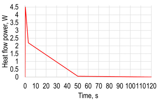 During this numerical simulation, the heating temperature dependency from time and displacement of polymer sheet from gravity are presented, the same as in Section 2. In this modeling, the heating is modeled as a point heating source, while in Section 2 it was modeled as air flow from a heat gun. By using ANSYS transient thermal together with transient structural analysis, a computational FE model of the same PVC Trovidur ESA-D sheet was created, and the geometric dimensions and properties of the elements used for the numerical calculations are collected in Table 1. Numerical analysis as described in Section 2 was conducted in two stages. The PVC sheet was excited with the heat flow source defined by the heat power varying in time, which corresponds to the point heating source. The properties of excitation heat flow parameters are presented in Table 4, and the corresponding curve in Figure 9.