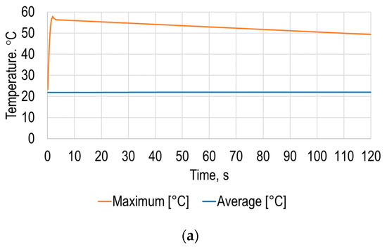 The simulation results allowed determination of the average and maximum dependence of the polymer sheet surface temperature on time (Figure 12a), from which it can be seen that the sheet surface temperature changes nonlinearly over time until it settles.