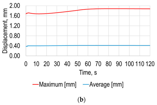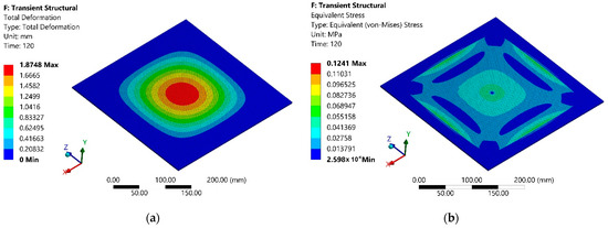 The next stage of the simulation was identical to that described in Section 2, and its scheme is the same as in Figure 4, and the main parameters were the same as in Table 3, and it only differed in simulation time, which was equal to 120 s. The simulation results of the total deformation of the polymer sheet after 120 s from the start of heating are presented in Figure 13a and the equivalent Von Mises stress dependencies of the polymer sheet at the same instance are in Figure 13b.