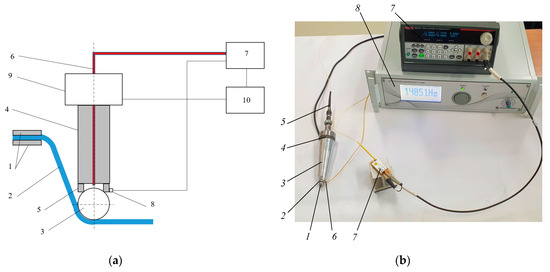 Polymer sheet SPIF with a laser heating: (a) schematics; (b) equipment: 1—metal sphere; 2—ring-shaped magnet; 3—waveguide; 4—ultrasonic vibration transducer-piezoceramic discs; 5—fiber optics; 6—temperature sensor, 7—laser diode module BMU25-940-01-R (Oclaro Inc., San Jose, CA, USA) with laser beam intensity controller Keithley 2230-30-1 (Keithley Instruments Inc., Cleveland, OH, USA), 8—ultrasonic vibration controller Sensotronica VT-400. (KTU, Kaunas, Lithuania).