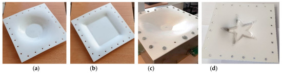 To verify numerical investigation results experimental research based on simulation parameters and process presented in Section 2 were carried out. During this phase of research experimental investigations of forming four different geometric shapes figures from polymer sheet, which material properties are presented in Table 1 was carried out. Scheme of experimental set-up which description was applied for patenting by the authors [21] and stand view are presented in Figure 16a,b, respectively. The main data of experimental research are collected and presented in Table 6.