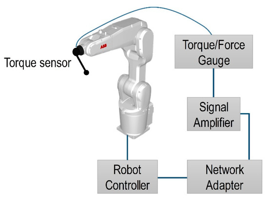 A standard version of ABB controller IRC5 M2004 was used to control industrial robot IRB1200 M2004. Unfortunately, it does not have analog inputs. In order to extend capabilities of the controller IRCS M2001 a DeviceNet network adapter CREVIS NA-9111 with analog input channels extension PicoScope-3424 (Pico Technology Ltd., Cambridgeshire, UK) was used. The Mark-10 STJ100 (Mark-10 Corp., Copiague, NY, USA) torque sensor that was used in the experiment can provide analog output of ±1 V at full scale and extended analog input, with a dynamic range of 0–10 V (PicoScope-3424). Therefore, in order to take full advantage of the dynamic range of 12 bits analog input the signal was amplified five times at the same time providing a positive offset voltage. The schematics of a robotized step-by-step feedback system is presented in Figure 19.