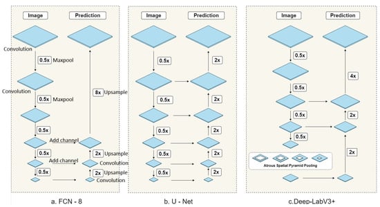 Architectures of (a) FCN-8, (b) U-Net, and (c) DeepLabv3+. The left downward flow of each model indicates the encoder part where the input is the three-channel color image. The right upward flow refers to the decoder part that outputs the final segmentation. Blue parallelograms indicate convolution operations; horizontal arrows from left to right show the channel additions from the encoder layers to the decoder layers; 0.5× boxes with the down-arrows refer to the max pool operations; 2×/4×/8× boxes with the up-arrows indicate the upsampling operation by 2, 4, and 8 factors, respectively. This figure is modified from [61].
