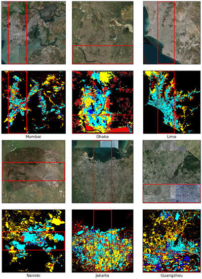 Input images and ground truths for other six cities. Red: highly informal area (arrival city); yellow: moderately informal area; cyan: moderately formal area; blue: highly formal area; black: uninhabited area.