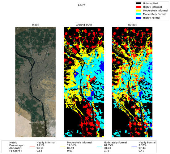 We notice that the model can segment the highly informal area with accuracy. The moderately informal area is a little bit difficult and error-prone compared to other classes. Various building material usage, irregular shapes and sizes, and no fixed building codes are the main factors that cause the model to categorize the informal area with a comparatively lower accuracy and F1-score. For example, this area consists of buildings with roofs with corrugated tin, concrete, bamboo, or even hardboards. Due to having very similar surface morphology, the moderately informal and highly informal areas are misclassified as each other. However, the moderately informal area has been segmented with reasonably high accuracy: . On the other hand, moderately formal areas can be segmented effectively with accuracy, with an F1-score of 0.75. Finally, the DeepLabv3+ could segment the highly formal area with an accuracy of and an F1 score of 0.41. An important characteristic of the highly formal area that contributed to a comparatively lower F1 score across the models is the highly formal area being intertwined with other classes. Mosques, parks, shopping centers, and highly formal housing projects often sprung up in the middle of a largely informal or moderately informal urban setting. A very insignificant percentage area—below for Cairo city, Figure 8 in the train-set, made this issue worse. However, the deep learning model can categorize urban areas with an average of .
