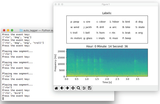 - User interaction. As shown in Figure 2, the script (1) displays a screen with the spectrogram—using the pyplot module of the matplotlib library—of the current window together with its start and finish times, (2) continuously reproduces the audio associated to the current window using the pyaudio library, and (3) shows the possible labels together with their associated keys in another screen. Then, each time the user presses a key corresponding to a label, the label is aggregated to the vector of labels associated with the current window. If the same key was pressed again, that event would be removed from the vector. Furthermore, the user can go to the following or previous acoustic window by using the arrow keys. Note that in this way, the user has a single interaction device (i.e., keyboard) and typos in labels are not possible.