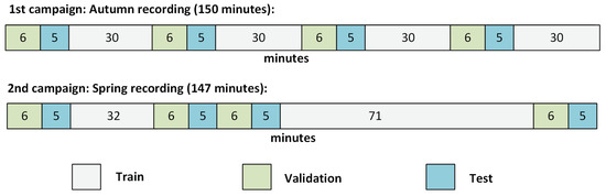 The audio files obtained on the recording campaign had to be divided into Train, Validation, and Test subsets. As soundscapes have temporal continuity, and so to evaluate the machine learning algorithm correctly, it is important to make sure these three data subsets are taken from different moments of the day, so that one single event is not split into different groups. Therefore, we tried to avoid or mitigate the fact that different audio samples with similar background noise were placed, for example, on both the Training and Testing sets.