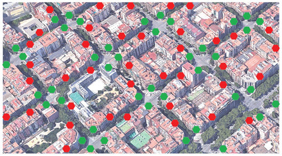 In Figure 7, we show a possible future location deployment of the sensors with a wider distance between them, which despite reducing the effects of physical redundancy, may make the nodes more aware of what happens in the streets, instead of focusing on the crossroads. This could open further research on discovering the optimal distance between sensors according to the symmetry of the streets and balancing accuracy with the number of sensors to be deployed. A further step in this analysis would be to study the deployment of the proposed system in other parts of Barcelona without the Eixample symmetry: narrower streets, irregular crossroads, small squares, and other urban layouts that may make distribution of sensors difficult, in order to cover all the events happening on the street.