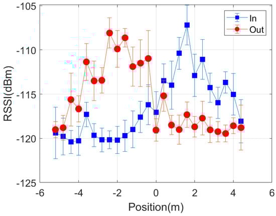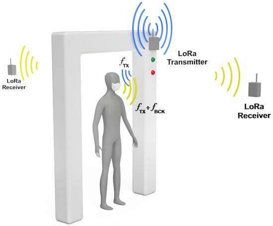 To determine if the smart mask is inside or outside of the building or room, two LoRa receivers are installed at the entrance of a building or room, as it is shown in Figure 3, one inside and one outside. Both receivers are tuned at a frequency-shifted channel. The transmitter is installed at the entrance, right in the middle point. The distance between the receivers and the transmitter is set to 2 m in the experiments. The use of two receivers has two main advantages, such as increasing the probability of receiving data packets under non-line-of-sight (NLOS) propagation conditions and determining if the subject has entered the building by comparing the received signal strength intensity (RSSI) of each receiver. From (10), the received power should be higher for the receiver closer to the tag and therefore it is possible to know if the person has crossed the door and in which direction. A simple classifier can be established from the RSSI or the signal-to-noise ratio (SNR) measured by the commercial LoRa receiver for the received packets. Unlike other backscatter-based communication systems proposed in the literature that require specific and often expensive SDR receivers, the system proposed here allows the use of commercial devices without having to make any modification. The system has been implemented using commercial Semtech SX1276 LoRa Transceivers. A low-cost (about 15 €) module from TTGO that integrates an ESP32 microcontroller with WiFi and a Semtech SX1276 is used in the experiments. LoRa transceivers are set with a spreading factor (SF) of 7, a bandwidth of 250 kHz, and a preamble length of 6. The air time of the packets is 18 ms. LoRa transmitter frequency is set to 868 MHz and backscatter shifting frequency  is set to 500 kHz. Consequently, LoRa receiver’s frequencies are set to 868.5 MHz. The power of the transmitter is set to 17 dBm.