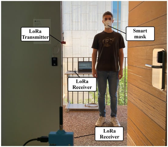 Figure 1 shows an overall operation sketch of the system. Figure 2 shows a typical scenario where the measurements have been taken. The main goal is to filter people quickly and efficiently without the need for an operator. For this purpose, LoRa transceivers are proposed to be placed at the entrance of public venues. Low-cost LoRa radios ensure scalability and commercialization with a low budget. The transmitter is placed at the entrance, while receivers are placed inside and outside the site. This distribution of LoRa transceivers allows determining the position with a sufficient level of accuracy, by means of the received signal strength. This method is limited by the range of the receiver, few meters around the entrance, but it is sufficient to determine whether or not the subject has crossed the entrance and where it was last detected. This property can be used to implement an automatic occupancy control system. The attenuation of the wall plays an important role in determining if the person is inside or outside. As the temperature sensor is inserted in the mask, it is possible to realize multiple measurements to check the body temperature, unlike when it is done with the infrared thermometer; this allows the system to get a set of temperatures and save them for further evaluation. Receivers work as a gateway, sending the data via WiFi to the cloud or a local server. However, no information that could violate privacy is stored.
