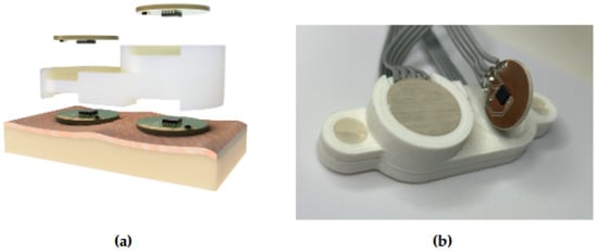 In the implemented prototype, a PLA housing that integrates and isolates the four sensors has been printed with a 3D printer, as can be observed in Figure 6. The height of each heat flux sensor is 5 mm and 10 mm, respectively, and the diameters are 20 mm. The body temperature  can be calculated after estimating the ratio K using (3). Experimental results will be provided in Section 3.