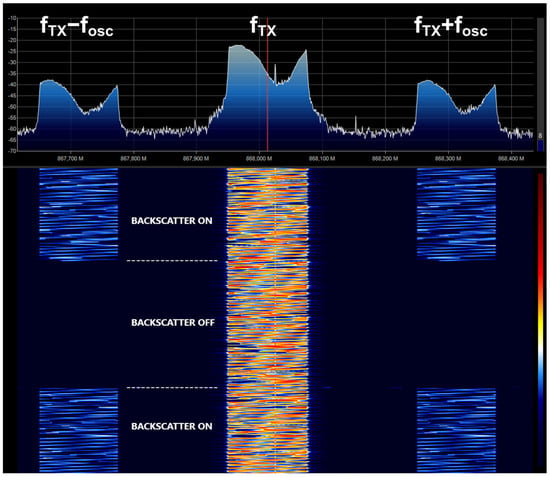 The feasibility of using backscatter communication for tag positioning and data communications is explored in this section. Backscatter communication is based on the principle of load modulation, where the impedance that is connected to the antenna is switched between two states. The result is a modulation of the incoming waves without creating its own RF transmission signal (see the schema of Figure 8). The switch works as a mixer. Consequently, the spectrum of the backscattered signal presents a shift of  respect to the frequency of the incoming signal , where n is an integer that indicates the harmonic index. The amplitudes of these harmonic components are proportional to the Fourier coefficient of the waveform that controls the switch (see in [] for details). Therefore, the amplitudes of the highest-order harmonics decrease very quickly, placing them below the noise floor and making them very difficult to detect. Different RF sources can be used such CW tones, WiFi, Bluetooth, or, as in this case, LoRa signals. In this work, the backscatter communication works over standard LoRa modulated packets. LoRa is a spread spectrum modulation derived from the existing Chirp Spread Spectrum (CSS) technology. High receiver sensitivity and robustness in front of interferences make LoRa ideal for low-power, long-range, and low data rate applications [,,]. If the oscillator frequency is properly selected, the signal reflected at the tag contains information on the adjacent channels. Therefore, when the backscatter has the modulation enabled, LoRa receivers tuned at the frequency of the shifted channel  can demodulate packets sent by a LoRa transmitter tuned at . Therefore, data can be sent at low speed by connecting and disconnecting the oscillator of the backscatter, observing the presence of the backscatter information in the shifted channels. Figure 9 shows the measured spectrogram (spectrum as a function of the acquisition time) at the output of an antenna connected to a software-defined radio receiver (RTL-SDR). This figure shows signal reception on the shifted channels when the backscatter modulation is enabled.