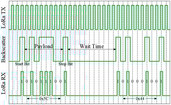 An on–off keying (OOK) amplitude modulation has been implemented in the smart mask (see Figure 11). The LoRa transmitter sends packets sequentially spaced 14 ms between them. When backscatter is activated, the LoRa packets are bounced to the side channel where the receivers are listening. The backscatter communication protocol sends a byte of data and two start/stop bits to indicate the start and the stop of the payload. Therefore, the frame length is 10 bits. The duration of each bit (32 ms) is the sum of a LoRa packet and the gap between each one of them. As the backscatter leaves a minimum time between frames equal to its frame length and considering the values mentioned above, the system can send frames every 640 ms, therefore the data rate is 12.5 bits/s. The package payload includes two main parts, the identifier and the sensor data (e.g., temperature or breathing rate). The identifier is vital in determining which data comes from each mask, taking the ones with a valid identifier and rejecting the ones that have crashed.