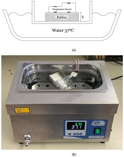 In order to find the thermal resistance ratio K an experimental setup similar to the one proposed in [] is conducted (see schema in Figure 12). This experiment allows to set the core temperature and check the calibration. A water bath at a temperature of 37° simulates the nominal temperature of the body. A copper container is placed floating on the water. Rubber sheets were used to emulate the skin and subcutaneous tissue. The thickness of the rubber can be increased by adding more sheets. Rubber material has been chosen because its thermal conductivity (0.17 Wm·K) is close to the value of the subcutaneous tissue. Then, the probe is located on the rubber layer and the thermal resistance ratio K is determined for different thicknesses from the measurement of the four temperature sensors using (4). The water temperature is monitored with a thermometer and controlled with a hot plate (with resolution of  °C). A nearly constant value as a function of the thickness of the rubber layer has been obtained (see the top plot in Figure 13). The room temperature is 25 °C. Using the value of the ratio  that has been found, the water temperature is estimated from another set of measurements (Figure 13). The differences produced could be attributed to poor lateral insulation of the prototype []. Despite this drawback, the error is typically below 0.5 °C.