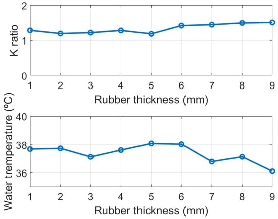 Thermal resistance ratio K (top) and estimated water temperature (bottom) as a function of rubber thickness.