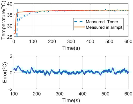 Comparison of the estimated core temperature with the dual heat flux sensor and measured in the armpit with a thermistor (top) and difference between both measurements after the initial response (bottom).