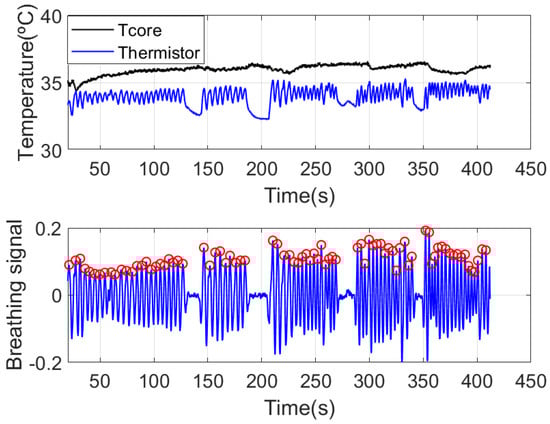 Estimated core temperature and measured frontal thermistor temperature for breathing rate estimation (top). Breathing signal after removing and filtering the baseline (bottom).