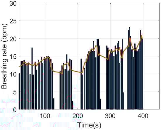 Estimated breathing rate (vertical bars) and average breathing rate (red solid line).