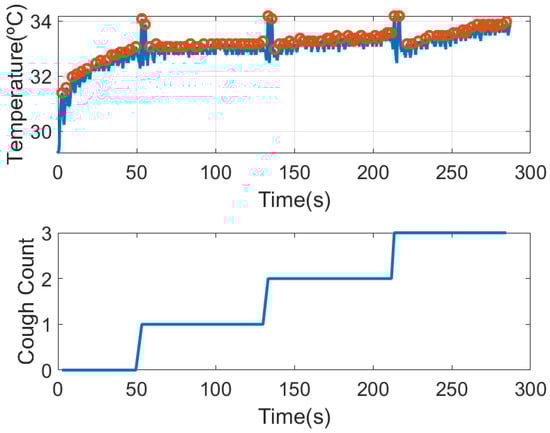The presence of cough is another symptom associated with COVID. The system has the ability to detect cough events. Figure 18 shows the temperature of the thermistor after installing the mask. It can be shown that it takes about 25 s to reach the steady state. The figure shows the maximum peaks associated with the breaths. Under these conditions, the amplitude of the peaks remain nearly constant. To show the detection of cough, in this figure, the subject has coughed three times. Coughs cause a rapid rise in temperature of ~1 degree due to the sudden expulsion of air. Therefore, by detecting these peaks and comparing the level with the average of the last 5 temperature peaks, a simple cough counter can be implemented (see graph at the bottom of Figure 18).