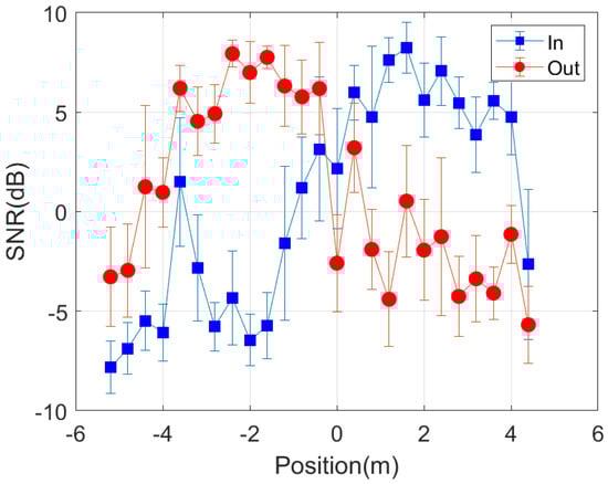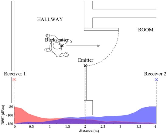 To investigate the fluctuations of the RSSI (or SNR) depending on the position, a comprehensive empirical model has been developed. Propagation models applied to wireless signals within buildings have been extensively studied in different contexts such as cordless phones and wireless local area networks (WLANs) [,]. The proposed model considers the effect of multipath propagation due to reflections on walls, floor, and large objects, the shadowing or blockage of the transmitter and receiver due to the proximity of the body, and the attenuation due to walls and doors along the path. The model introduces an additional attenuation to the receiver power given by (10)