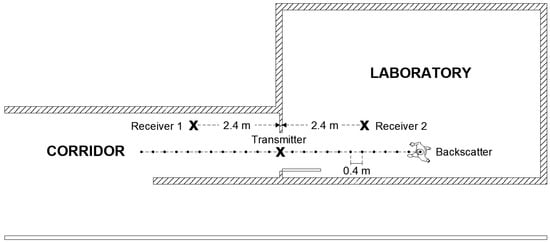Photography of the measurement scenario. LoRa transmitter is placed at the entrance. LoRa receivers are placed inside and outside of the laboratory.