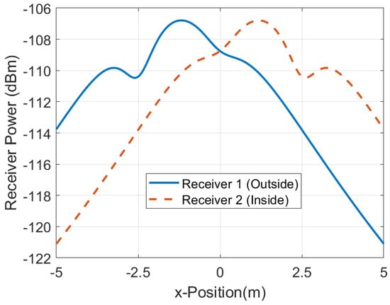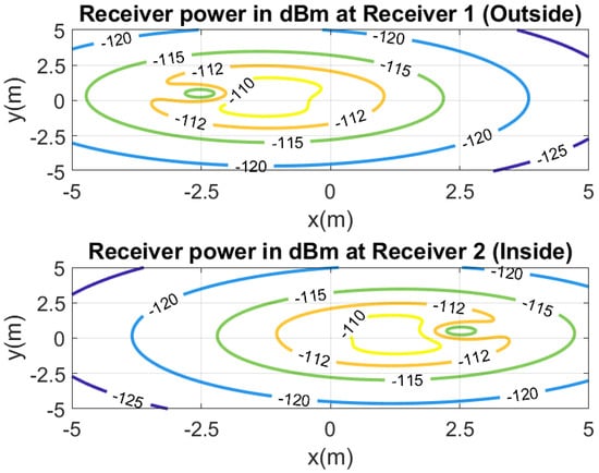 Simulated received power (RSSI) at the receiver located inside (top) and outside (bottom).