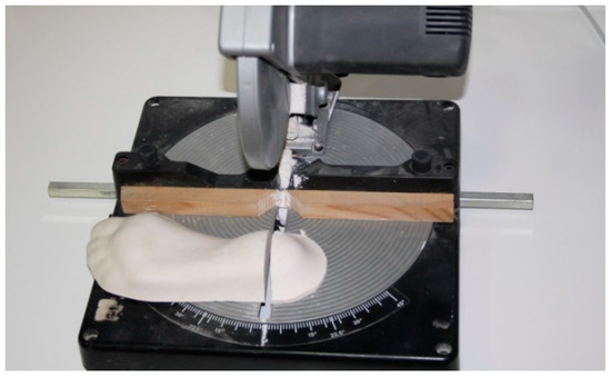 Having obtained three casts from the same foot, we cut each heel perpendicularly on the longitudinal axis of the foot (Figure 4) with a table-cutting saw, by the zone of maximum longitudinal and transversal curvature of the heel (Figure 5). This left us with its outline on the frontal plane.