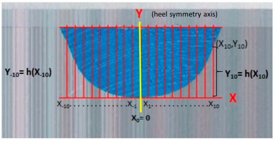 Figure 5. Processing for the measurements of the distinct points of the curve and to determine its symmetry index. 10 coordinates were estimated in each half heel from −10 to +10, beside symmetry “Y” axis (yellow line). For example: (X10, Y10) coordinates were determined measuring the distance of X10 on X axis, and the high of Y10 (h(X10)) on Y axis. For each foot, 20 coordinates were determined, 10 in each half of the heel. The sum of this coordinates is included in the equation.