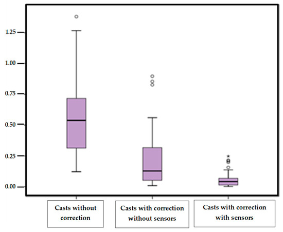 Shapiro–Wilk test for small samples verified that the distribution did not meet normality criteria, therefore non-parametric test was chosen. Friedman’s bidirectional analysis of variance by ranges for related samples was used to compare casts without sensors in the three measurements obtained (p = 0.093) and to compare casts with sensors in the three measurements (p = 0.882)