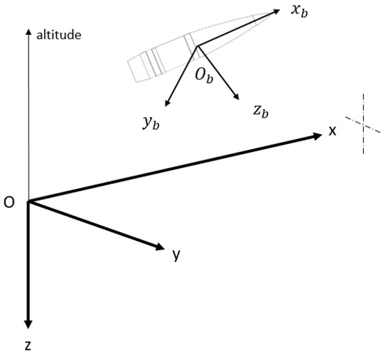The projectile trajectory was generated based on a vehicle dynamic model, Balco. This is a six- and seven-degree-of-freedom (6-7DOF) trajectory simulation program based on the mathematical model defined by the NATO Standardization Recommendation 4618 [27]. The primary goal of Balco is to compute high-fidelity trajectories for both conventional and precision-guided projectiles. The outputs of Balco software tool used in this work are the position, the velocity, the Euler attitude angles, the actual accelerometer and magnetometer outputs, as well as the angular velocity vector (this latter will be used only for performance comparison). Figure 2 illustrates the simulated free flight trajectory with the local frame defined such that (Ox) is 120° from the north direction clockwise in the Earth’s tangent plane and (Oz) is vertical downward.