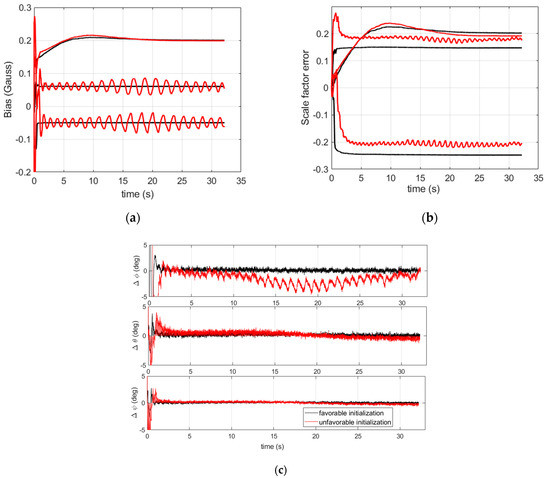 Comparison between favorable and unfavorable attitude initialization. (a) Magnetometer bias estimates; (b) magnetometer scale factor error estimates; (c) attitude errors. Case of a favorable attitude initialization combined with small covariance matrices (black curves) along with unfavorable attitude initialization combined with inflated covariance matrices (red curves).
