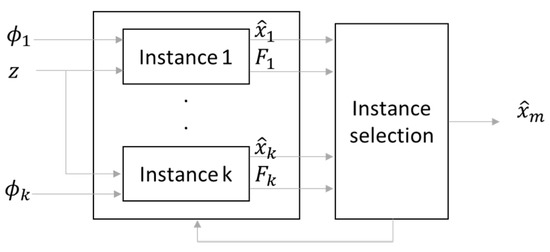 In order to cope with the initialization dependency of the filter while avoiding a significant covariance inflation, multiple instances of the KF can be run in parallel over a short time following the start time of the mission (see Figure 4). Each instance is initialized with a different starting value of the roll component ( for the kth instance), receives the measurement input () and produces an estimate of the state () as well as a convergence indicator computed on measurement residuals (). Instances of the filter with bad initial values of the roll angle will have larger indicator values than the instances with favorable initial roll values. Hence, a decision function identifies the instance with the best convergence indicator, which will be maintained until the end of the mission and, at the same time, kills all the other instances for the rest of the mission. The final state is the one obtained at the output of the winning instance. The convergence indicator of the KF is set to be the sum of the squared residuals (SSR) of a single component of the Earth’s magnetic field in the local frame, normalized by the residual magnetometer measurement variance . This value is taken from the residual covariance matrix for a filter having converged (correctly initialized); thus, it is determined beforehand during the filter tuning step and provided to the filter bank. Note that the convergence detection is based on the magnetometer measurement residual because any bad attitude estimate will shift the expected magnetic field w.r.t. the measured field. The convergence indicator is computed over an interval of samples taken once the filter is supposed to have converged ():