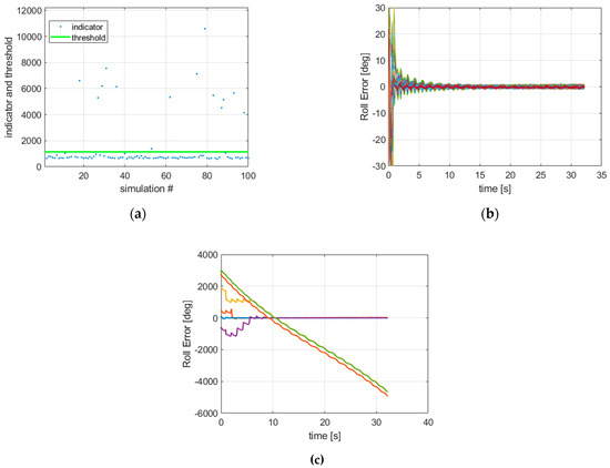 Results of a single filter initialized by random roll angle values. (a) Convergence indicator with convergence threshold; (b) roll estimation errors of the simulations that passed the test; (c) roll estimation errors of the filters that failed the test (note here the roll error has been unwrapped to allow the divergence to be seen graphically).