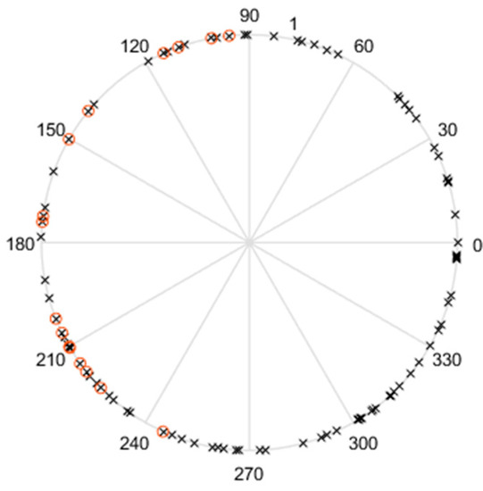 Initial roll angle errors (degrees) given by the crosses x. The values that failed the test are encircled.