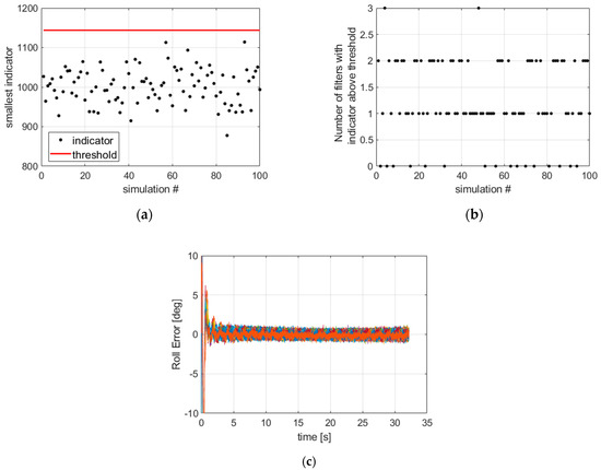 (a) The smallest indicator among the four filters is always below the threshold (corresponding to a pfa of 0.001); (b) the number of filters with indicator above threshold shows there is no case where the four filters failed at the same time; (c) 100 curves of the roll error at the output of the filter bank showing that all the simulations have converged.