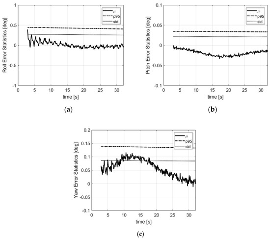 Attitude error statistics: (a) roll; (b) pitch; (c) yaw. µ is the mean error, std is the standard deviation, p95 is the 95% deviation w.r.t. the mean.