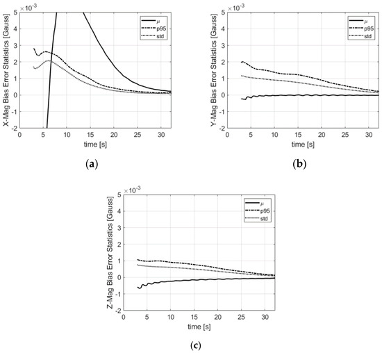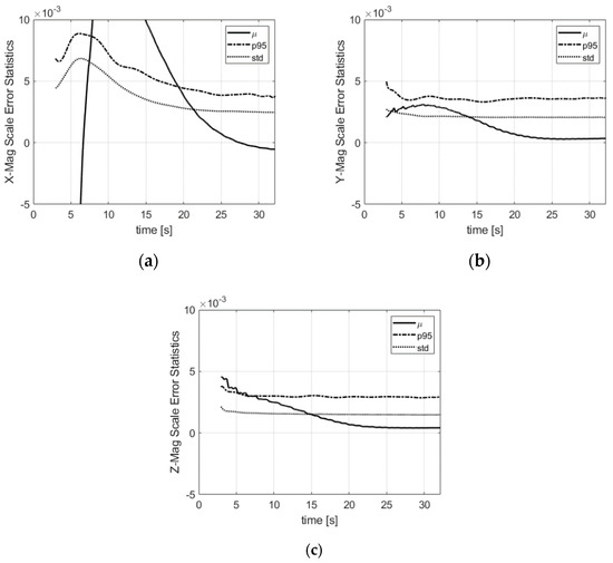 Magnetometer scale factor error statistics in the body frame: (a) x-direction; (b) y-direction; (c) z-direction. µ is the mean error, std is the standard deviation, p95 is the 95% deviation w.r.t. the mean.