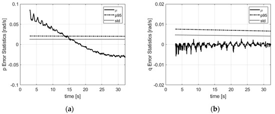 Body-frame angular velocity error statistics: (a) x-direction; (b) y-direction; (c) z-direction. µ is the mean error, std is the standard deviation, p95 is the 95% deviation w.r.t. the mean.