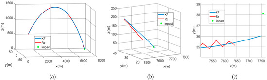 (a) The estimated 3D trajectory in the local frame (KF) along with the raw GPS receiver trajectory (Rx) and the actual position of impact; (b) zoom in of (a) around the end of the trajectory; (c) projection of (b) in the x-y plane.