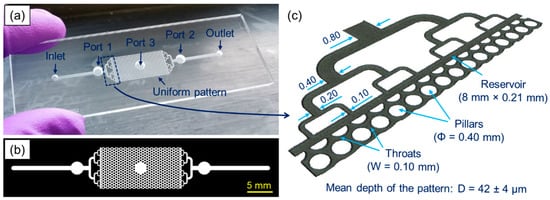 The microfluidic device tested has a uniform pore network pattern (15.58 mm long and 8.00 mm wide) that represents a ‘generic’ porous test structure. Such, and similar, patterns are often used as benchmarks to investigate flow, transport, and reactive processes in porous media [,,,]. The pattern consists of circular pillars with a diameter of 0.4 mm, which are evenly spaced from each other by 0.5 mm, creating a uniform network of microchannels with 0.1 mm wide throats (see Figure 1c). An average depth of the pattern is 42 ± 4 µm, as measured using a 3D surface profilometer (Alicona G4 InfiniteFocus, Alicona Imaging GmbH, Austria). The pattern does not have pillars in the center (see Figure 1b) because this area was reserved for an additional sensor port. On both sides of the pattern, there are rectangular areas (8.00 mm × 0.21 mm) and bifurcated channels that were designed to evenly distribute the injected fluid into the uniform pattern. The channel dimensions are given in Figure 1c. At a distance of 12.5 mm from the inlet and the outlet (see Figure 1b), there are also two circular areas with a diameter of 2.5 mm (called Port 1 and Port 2), which were reserved to embed the sensors. The volume of the pattern between Ports 1 and 2 was calculated to be 3.1 µL, whereas its total volume is 3.9 µL.