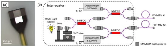 Figure 2b shows a schematic of the in-house designed, bespoke interrogation system that was used to measure changes in the FP cavity length of the FOP-MIV sensors. The interrogation system comprises a tungsten bulb (white light source), a focusing lens (×10 0.25 NA microscope objective), three 2 × 2 multi-mode fiber optic couplers (MMFOC) with a 50/50 split of optical power (TM50R5S2A, Thorlabs Inc., USA), four SMA to SMA mating sleeves, and two spectrometers (S2000, Ocean Insight, USA). The control of the S2000 spectrometers, data acquisition, and real-time processing of the optical spectra from both sensors were performed in LabVIEW (National Instruments, USA) using a bespoke interrogation algorithm.