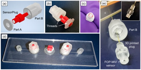 The same microfluidic device was used to test the FOP-MIV pressure sensors. Since Parts A were permanently attached to the device, the FOP-MIV sensors required special adapters that would allow the sensors to be connected using the existing Parts A and B. For this purpose, additional custom male mini-Luer plugs (see Figure 3e) were manufactured from clear photocurable resin using the Formlabs 3D printer. The adapters have a through hole with three different diameters (see the insert of Figure 3e). The first section of the hole has a length of 1 mm and a diameter of 0.8 mm, so it is large enough to accommodate and protect the sensor from damage while handling and inserting the plug into Part A. The middle section of the hole has a diameter of only 0.3 mm, and hence, it is smaller than the sensor body but still is larger than the diameter of the optical fiber. This section was designed to prevent the sensor from being inserted too far into the plug during its assembly. The third section of the hole has a diameter of 1.0 mm and is large enough to apply a small amount of glue (Araldite Standard) to fix the optical fiber and seal the plug from the top.