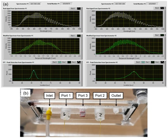(a) Reflection spectra acquired by the spectrometers when the FOP-MIV sensors are connected to the interrogation system, and (b) close-up on the FOP-MIV sensors attached to the microfluidic device via Port 1 and Port 2.