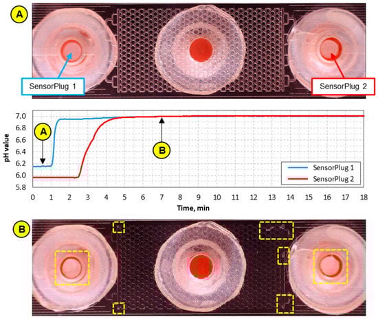 pH values recorded by the SensorPlugs during the injection and flow of pH 7.03 buffer with a rate of 2 µm/min. Images (A) and (B) were taken before and during the injection of the buffer, respectively. The boxes in Image (B) indicate the areas with trapped air.