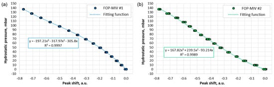 The FOP-MIV sensors were embedded into custom 3D-printed plugs, as shown in Figure 3e, and then were calibrated against hydrostatic pressure, as described in Section 2.5. Figure 7 shows the calibration results for both sensors. The hydrostatic pressure was calculated using Equation (1), whereas the peak shift was determined based on the data acquired by the interrogation system (described in Section 2.2.2 and Section 2.5). Since the hydrostatic pressure exerted on the sensor diaphragm reduces the length of the FP cavity, the characteristic peak for each sensor in the Fourier domain is shifted toward zero (see Figure 5a); hence, the peak shifts have negative values.