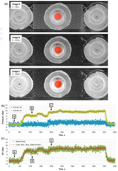 The DI water was injected into the microfluidic pattern with a rate of 4 µL/min to displace the air. Initially (see Figure 8a, Image A), the FOP-MIV sensors did not detect any change in pressure because water had not yet reached Port 1, whilst the pressure increase due to flow of air at 4 µL/min was apparently below the sensor sensitivity. An increase of pressure was detected by FOP-MIV #1 when water arrived at Port 1 and started to flow through it. When water arrived at Port 2 (see Figure 8a, Image B), FOP-MIV #2 sensor did not immediately detect an increase of pressure. This was delayed by approximately 90 s until water reached and started to form a droplet at the outlet (see t = 220 s in Figure 8b). After an additional 90 s, the pressures in Ports 1 and 2 obtained equilibrium (P1 = 9.3 ± 0.4 mbar and P2 = 1.4 ± 0.7 mbar), and the pressure difference (ΔP) was measured to be 7.9 ± 0.8 mbar. The distribution of DI water within the pattern (see Figure 8a, Image C) did not change for the rest of the injection.
