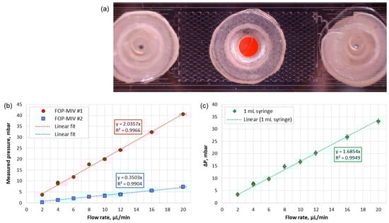 The FOP-MIV sensors are usually delivered with an electronic chip attached to the fiber optic connector. The chip contains calibration data that can be read with an appropriate reading unit, e.g., the SKR module manufactured by FISO Technologies Inc. []. However, in this work, the SKR reading unit was unavailable, and therefore, it was necessary to calibrate the sensors before they were attached to the microfluidic device. To do so, the FOP-MIV sensors were calibrated against hydrostatic pressure (Ph), immersing the sensors at different depths () in a 145 cm high glass cylinder filled with water. The Ph values were calculated using the following equation [] (p. 263):