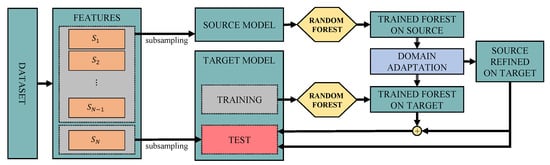 In the next step, we divide the number of repetitions of , using one part as a test and the remaining as intra-subject training in order to compare the results for domain adaptation. Then, is used as input to train a random forest classifier [], which is a collection of decision trees. In this way, a forest trained on the source is obtained. In the same way, is passed to another random forest classifier, building another model trained on the target as result.