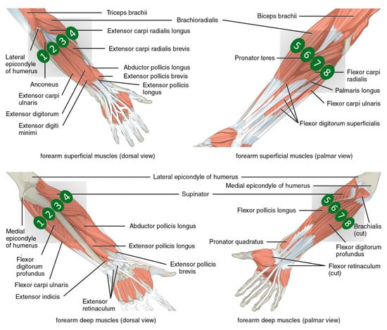 Positioning of the electrodes and underlying specific muscles. The image was adapted using file licensed under the Creative Commons Attribution 4.0 International license (Picture was adapted using https://upload.wikimedia.org/wikipedia/commons/7/73/1120_Muscles_that_Move_the_Forearm.jpg (accessed on 1 November 2021) from the Textbook OpenStax Anatomy and Physiology (source: https://cnx.org/contents/FPtK1zmh@8.25:fEI3C8Ot@10/Preface, accessed on 1 November 2021)).